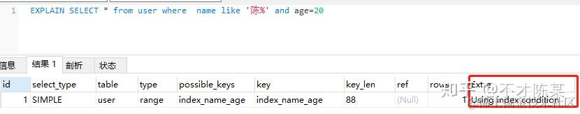 - 根据explain解析结果可以看出Extra的值为Using index condition,表示已经使用了索引下推。
