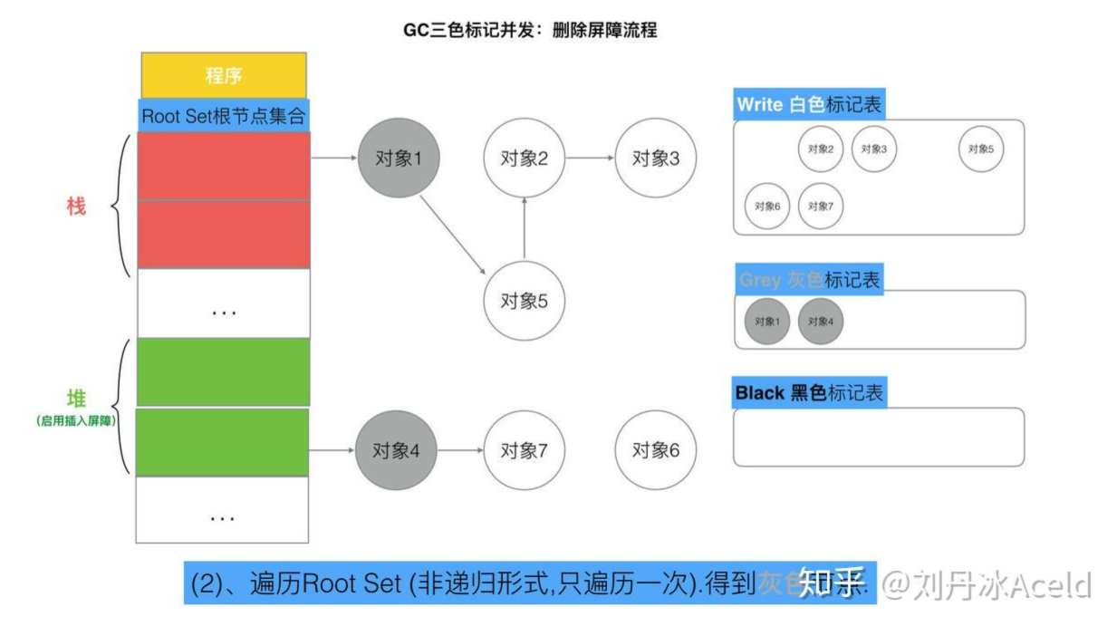 - 1、GC开始将栈上的对象全部扫描并标记为黑色(之后不再进行第二次重复扫描,无需STW),